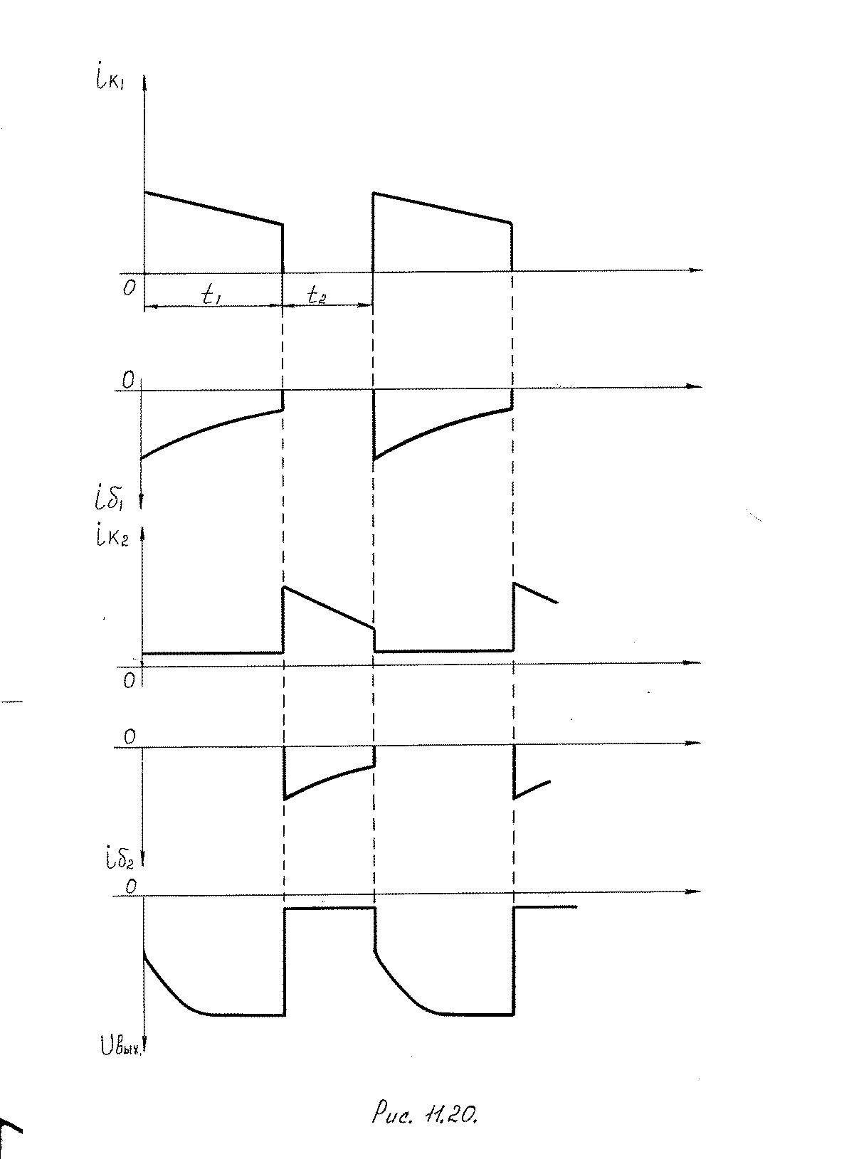 В начальный момент времени t = 0 (рис. 49) транзистор VT1 открылся, транзистор VT2 закрылся, конденсатор С2 начинает заряжаться через открытый транзистор VT1 и резистор Rk2 .