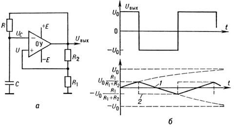 Рис. 50. Симметричный мультивибратор на операционном усилителе:a- схема;б- временныедиаграммы напряжений;1− напряжениеUC;2- напряжениеU.