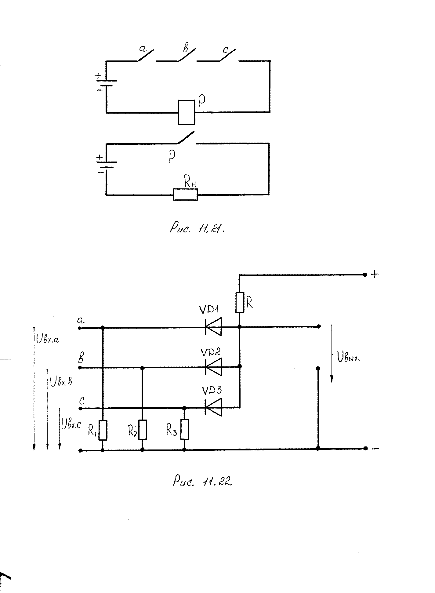 На рис. 53 эту же функцию выполняет схема на полупроводниковых диодах. При R> R1 = R2 = R3 напряжение Uвых близко к нулю. Напряжение на выходе схемы появится только при подаче положительного напряжения на все три входа схемы.