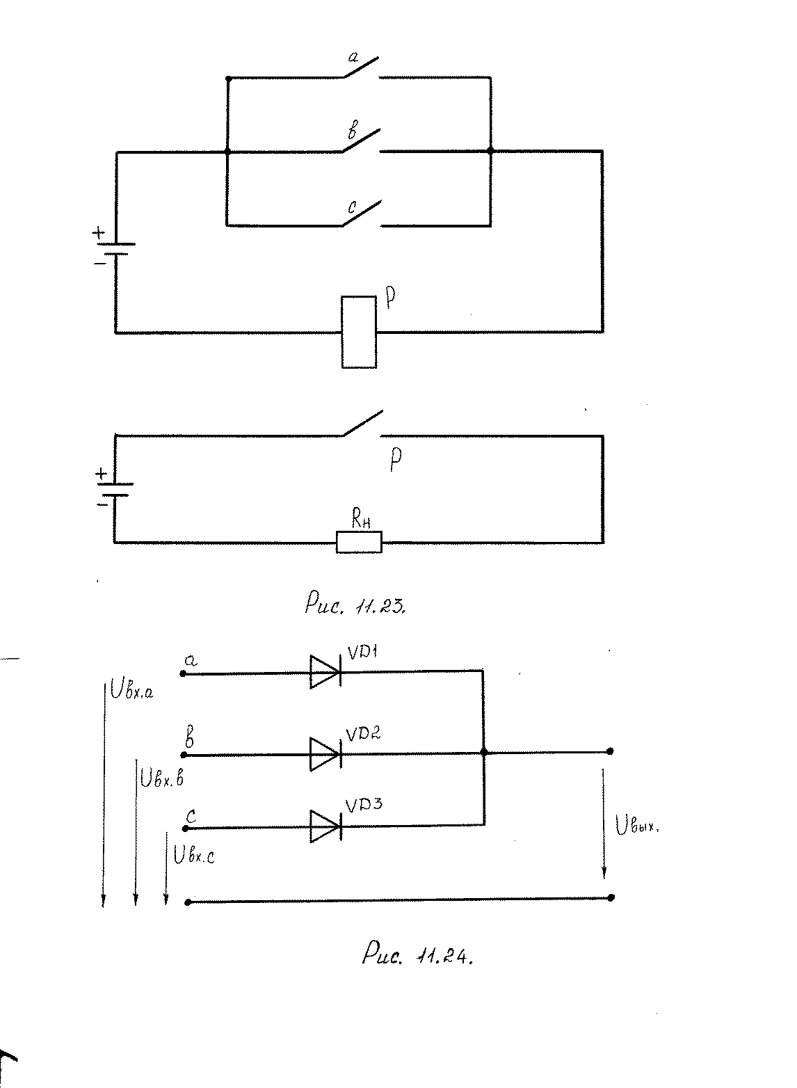 В релейной схеме рис. 54 контакты а, b, с включены параллельно, поэтому ток в реле наблюдается уже в том случае, когда замкнут хотя бы один из трех контактов.