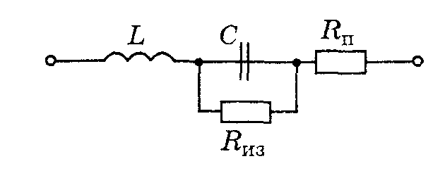 где L — определяется конструкцией, размерами обкладок и ограничивает частотный диапазон применения, Rиз — сопротивление изоляции, Rп — сопротивление потерь, поскольку под действием переменного поля изменяется состояние диэлектрика, на что требуются затраты мощности. Сопротивление Rпуказывает на то, что напряжение и ток реального конденсатора сдвинуты по фазе на угол меньше 90° в частотном диапазоне, в котором индуктивностью можно пренебречь.