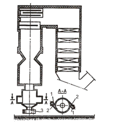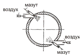 Основное количество необходимого для горения воздуха (70 – 80 %) вводится в циклон со скоростью около 70 м/с через два вертикальных тангенциальных сопла. В каждом сопле установлены две мазутные механические форсунки производительностью по 1,25 кг/с при давлении мазута 2,85 МПа. Остальной воздух подается со скоростью 30 м/с через аксиально улиточный ввод. Предусмотрена также подача в улиточный ввод и дутьевые сопла газового топлива.