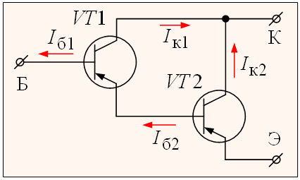 Соединение из двух или трёх транзисторов – составной транзистор – позволяет получить существенное увеличение коэффициента усиления по току или другие отличительные свойства по сравнению с одиночным транзистором.