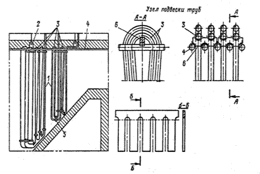 1 – змеевик; 2 – подвесные планки; 3 – верхние изгибы труб;