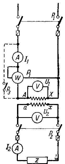 Для опыта короткого замыканиязажимы вторичной обмотки ax должны быть замкнуты накоротко проводом малого сопротивления, а к первичной подводится пониженное напряжение с таким расчетом, чтобы ток в первичной обмотке был равен номинальному (I1 =I1H). После этого измеряют UK, I1H и PK. Тогда подсчитывают: