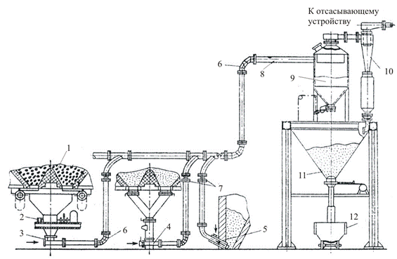 9 – осадительная камера; 10 – циклон; 11 – бункер; 12 – вагон