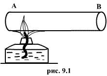 ,имеют смысл только тогда, когда тело находится, хотя бы приближенно, в так называемом состоянии термодинамического равновесия (т.д.р.). Так называется состояние, в котором все термодинамические параметры остаются со временем постоянными (к этому следует добавить еще условие отсутствия стационарных потоков). Если, например, быстро подогревать газ, как это показано на рис. 9.1, температура непосредственно подогреваемой части сосуда А окажется выше температуры части В. Не будут равны и давления в частях А и В. В этом случае не имеет смысла понятие температуры