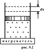 Работа над газом выполняется внешними силами при его сжатии. Работа самого газа выполняется при его расширении. Пусть газ расширяется так, что поршень на рис.9.2 поднимается на величину dx. Тогда газ выполнит работу