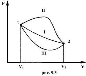 Процесс расширения от объема V1 до объема V2 может происходить различным образом: например, можно при этом изолировать газ от нагревателя или, наоборот, нагревать газ и т.д. Иначе говоря, при перемещении из точки 1 в точку 2 в газе могут происходить различные процессы, даже если зафиксировано начальное и конечное состояния. В каждом процессе работа будет иметь свое значение, так как площадь под кривой процесса будет различной (кривые I, II, и III на рис.9.3). Таким образом, выполняемая газом работа зависит от процесса, который с ним происходит. Обычно (хотя это и не совсем точное выражение) говорят, что «работа газа есть функция процесса».