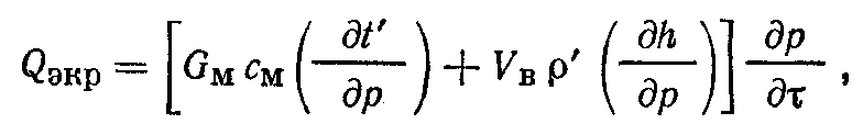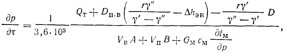 где Gм и см—масса и теплоемкость металла трубы; ∂t'/∂р и ∂h/∂р — изменения температуры и энтальпии воды на линии насыщения понижением давления; ∂р/∂τ — изменение давления среды во времени; Vв — объем воды.