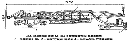На рис. XI.9 показан стационарный приставной кран КБ-573, устанавливаемый на бетонном фундаменте. Его грузоподъемность 10 т на вылете крюка 20 м, 4 т на вылете крюка 40 м при высоте подъема 150 м. Кран имеет 27 секций. Наращивают кран с помощью монтажной стойки, которая приподнимает на высоту секции верхнее плечо башни, а в образовавшийся промежуток специальной лебедкой поднимают и заводят очередную секцию башни.