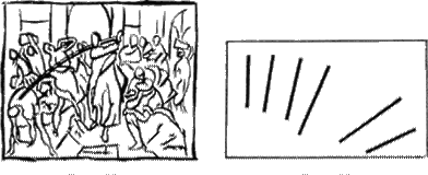 Другой пример — это картина Питера Брейгеля «Слепые». Слепые тянут друг друга в ров. Согласованная форма соединяет шесть фигур в ряд тел, которые начинают постепенно скатываться и, наконец, падают. На этой картине последовательно изображены стадии одного и того же процесса: беззаботность, растерянность, тревога, заминка и, наконец, падение. Подобие фигур выражается не в строгом повторении предыдущего, а в постепенном изменении (рис. 53), и глаз зрителя вынужден следовать за направлением этого процесса. Принцип движущегося изображения применен здесь для согласования одновременных фаз в пространстве.