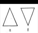 Возьмем модель, в которой одна из осей в высшей степени превалирует над всеми остальными. Если эту модель развернуть на 180 градусов, то она приобретет другой облик, даже если геометрическая форма останется прежней. Поворот на 180 градусов воспринимается не как отклонение от вертикального положения, а скорее как новая модель со своим собственным устойчивым основанием. В сюрреалистических фильмах человеческие лица зачастую показываются перевернутыми. В результате возникает чувство страха. Даже если мы и осознаем этот режиссерский трюк, тем не менее, невозможно отделаться от впечатления, что перед нами новый тип лица, разновидность какого-то чудовища, у которого рот расположен выше его собственных глаз, веки закрываются не сверху вниз, а наоборот, волосы же растут где-то внизу. Представление о том, что перед нами новый тип лица, подтверждается и его собственной симметрией, так как оно выглядит вполне самостоятельным и имеющим правильную ориентацию. Менее яркие примеры могут быть найдены повсюду, например, в случае с равнобедренными треугольниками (рис. 62). Даже если двум фигурам присущи основные свойства треугольника, все же их формы могут восприниматься весьма различно. Фигура, обозначенная буквой «а», возвышается на прочном основании и имеет острую вершину. Широкий верх фигуры «b»тяжело и рискованно балансирует на одной точке, расположенной в основании.