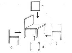 Элементарная задача изобразить основные признаки формы предмета на плоской поверхности на деле оказывается довольно трудной. Следует ли портрет данного человека показать в профиль или анфас? Г. К. Честертон говорил об одной женщине, что он «мысленно всегда представлял себе ее профиль как ясно очерченное острие какого-то оружия». Для нужд полиции всегда требуются оба снимка (анфас и в профиль), потому что важные характерные черты личности (в антропометрическом отношении) могут проявляться лишь в одном из снимков. Дальнейшее осложнение привносится тем фактом, что некоторые части объекта лучше воспринимаются под одним углом, в то время как остальные — под другим углом зрения. Типичная форма буйвола лучше всего воспринимается с боковой стороны. Правда, при этом нельзя увидеть характерную форму лиры, которую образуют его рога. Распростертые крылья летящей утки нельзя увидеть, если ее сфотографировать в профиль. Угол, который следует выбрать, чтобы узнать бокал и ножку рюмки, исказит круглую форму горлышка и основание этих сосудов. Данная проблема возникает и в случае сочетания объектов: каким образом можно изобразить в одной картине пруд, правильное представление об очертании которого можно получить лишь с высоты птичьего полета, и деревья, типичные формы которых проявляются лишь в профиль? Возьмем явно простой предмет — стул (рис.66). Вид сверху (а) соответствует форме сиденья. Вид спереди (b) изображает форму спинки стула и ее симметричное расположение по отношению к передним ножкам. Вид сбоку (с) все эти свойства скрывает, но зато воспроизводит другую важную черту — прямоугольное расположение спинки стула, его ножек и сиденья. И только, наконец, в виде снизу (d) можно обнаружить симметричное расположение четырех ножек по углам сиденья, представляющего собой форму квадрата. Вся эта информация является необходимой для образования правильного зрительного представления о данном предмете. Как можно ее передать в одном и том же рисунке?