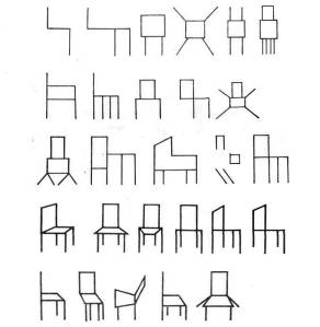 О тех трудностях, с которыми связана эта задача, довольно красноречиво говорят данные, по лученные Георгом Кершенштайнером [4] (рис.67). На этих рисунках в схематичной форме изображены типичные варианты решений, выполненных школьниками, после того как их попросили воспроизвести по памяти «трехмерное изображение стула с учетом правильной перспективы».