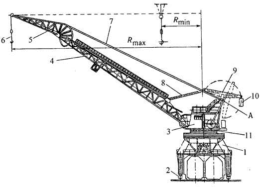На поворотной платформе размещена кабина 3 с крановыми механизмами: лебедкой механизма подъема, механизмом поворота, механизмом изменения вылета стрелы. Конструктивная схема портального крана характеризуется типом его стрелового и опорно-поворотного устройства. В современных портальных кранах наибольшее распространение получили шарнирно-сочлененные и прямые стрелы.