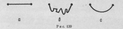 кажутся более близкими по отношению к воспринимающему субъекту. Изображение а на рис. 129 будет восприниматься как поверхность, находящаяся сверху простирающегося основания, которое представляет собой плоскость b. Все это вызывает специфические психологические проблемы. Любая точка пространства а расположена к воспринимающему субъекту гораздо ближе, чем любая точка плоскости b. Однако это различие в расположении по глубине не привносится какими-либо процессами, возникающими непосредственно в самой точке. Оно возникает в силу отдаленного воздействия контура. Следовательно, поверхность, которую мы видим внутри контура, также создается отдаленным воздействием контура. Эта поверхность может иметь любой внешний облик, подобно тому как прямолинейность кожи, натянутой на барабане, представляет собой только один из бесчисленного ряда обликов, которые можно было бы получить, если бы вместо кожи на барабан натянули столовую скатерть. И все-таки поверхность, которую мы видим внутри окружности, ровная (рис. 130,а), а не какая-либо из кривых, изображенных на рис. 130, b и 130, с. Ровная плоскость есть самый простейший вариант изображения окружности, и любое изменение контура вызывает соответствующие изменения внутренней поверхности, приобретающей всегда наипростейший внешний облик.