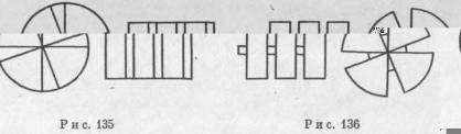 Впервые попытка систематического исследования психологического феномена «фигура — фон» была предпринята Е. Рубиным. Он обнаружил ряд условий, которые определяли, какая поверхность в данной модели приобретает характер «фигуры». Одна из открытых им закономерностей гласит, что поверхность, заключенная в пределах определенных границ, стремится приобрести статус фигуры, тогда как окружающая ее поверхность будет фоном. Это, вероятно, влечет за собой еще одну закономерность, согласно которой поверхность, обладающая меньшей пространственной площадью, становится при определенных условиях фигурой. Узкие полоски или сектора, изображенные на рис. 135, воспринимаются лежащими сверху. Если мы попытаемся представить себе противоположное отношение, то испытаем сильное сопротивление модели. Однако следует заметить, что эта закономерность имеет место только тогда, когда более широкие изобразительные единицы размещены таким образом, что они в состоянии образовать сплошной фон, имеющий простое очертание или являющийся бесконечным. На рис. 136 ситуация прямо противоположная. Элементы, имеющие меньшие размеры, образуют сплошную модель, которая расположена под изобразительными единицами, обладающими большими размерами. В общем, законы перспективы подразумевают, что, чем больше размеры объектов, тем ближе расположенными они кажутся для воспринимающего их субъекта. Двойная функция контурных линий в изображениях на рис. 135 делает более эффективным закон «подобия по месту расположения», согласно которому, чем ближе расположены друг к другу линии, тем с большей легкостью они группируются вместе при восприятии. Я уже указывал на тот факт, что когда поверхности являются пустыми, то контурные линии создают различие в плотности и в