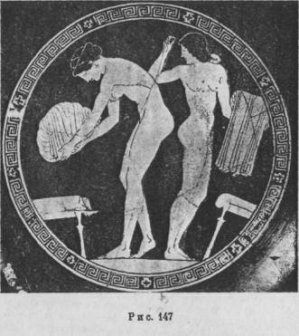 В качестве иллюстрации того, как факторы, стремящиеся сделать неясными отношения «фигура—фон», обнаруживаются почти что по всей картине, может с успехом послужить рисунок «Мадам Режан», выполненный художником Обри Бердслеем (рис. 146). В противоположность этому рис. 147 дает только отчасти успешное решение данной проблемы. Доминирование женских фигур на этом рисунке обеспечивается их узкими формами и выпуклыми контурными очертаниями. Очертания двух больших узлов с одеждой подчеркиваются текстурой складок. С другой стороны, темные промежутки, заполняющие пространство между фигурами, настолько узкие и настолько замкнуты, что они сами воспринимаются почти как самостоятельные фигуры. Несмотря на то что ослабленный эффект от воздействия явления «фигура — фон» точно определяет и характеризует каждую деталь рисунка, тем не менее он оставляет возможность для игрового чередования темного и светлого, формы зна-