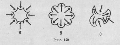 В этой связи необходимо остановиться на дальнейшем исследовании аспектов зависимости «фигура—фон». До сих пор я описывал этот психологический феномен в сугубо статических терминах, таких, как расположение в пространстве, контур, плотность. В то же время в самом начале этой книги я выдвинул тезис, что любое восприятие является динамичным. Другими словами, объект восприятия и его результат следует описывать как конфигурацию сил. Это справедливо также и в отношении объектов восприятия, рассматриваемых нами в настоящей главе. «Фигура» — это не только ограниченное пространство, лежащее сверху. Она активно вырывается из оков этой поверхности. Она энергично стремится покинуть основание и распространиться наружу во всех направлениях. Размер промежутков между плотными массами довольно часто недооценивается. Как будто иррадиация частей фигуры заставляет их выглядеть меньшими, чем они есть на самом деле. Агрессивность выпуклой формы и получающееся в результате сжатие фона приводит к воздействиям, которые указаны на рис. 149 стрелками. На рис. 149, с показано, каким образом выступающие части статуи выталкиваются вовне, тогда как окружающее их пространство вторгается и захватывает вогнутые поверхности.