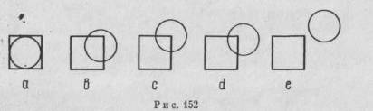 Закономерности феномена «фигура—фон» относятся к ограниченному виду пространственных взаимоотношений между фронтальными плоскостями. На этом следует остановиться подробнее. На рис. 152 мы замечаемпрежде всего различные степени подразделений в пределах одной и той же двухмерной плоскости. Простое pacположение квадрата и окружности, представленное на рис. 152, а, образует строго унифицированную целостную модель. Центр окружности совпадает с центром квадрата, а диаметр окружности равен одной изсторон квадрата. Максимальное подразделение показано «а ряс. 152, е. Всеобщая симметрия модели, изображенной на рис. 152,а, способствует свободному сочетанию двух частей, которые не касаются друг друга и которые являются симметричными сами по себе. Примеры наложения каждой части друг на друга по-казаны на рис. 152, b, с, d. Во всех трех изображениях чувствуется тенденция ослабить пли, может быть, даже нарушить единство целого посредством раскалывания композиции на две части. Однако можно наблюдать, что в этих примерах подобная тенденция меньше всего заметна на рис. 152, с, потому что центр окружности расположен на диагонали квадрата и совпадает с одним из его углов. Этот момент создает симметрию относительно диагоналей квадрата и усиливает единство всей композиции в целом.