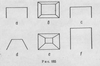 Модели в виде тех, которые представлены на рис. 163, могут быть получены путем фотографирования квадратов и кубов под наклонным углом. В объемномварианте эти модели очень часто приобретают форму физических объектов, проекцией которых они являются. Это явление побудило психологов сформулировать следующую психологическую закономерность. Несмотря на наличие искажений, возникающих на сетчатке глаза, объекты воспринимаются почти в соответствии с их физической формой и размером (принцип постоянства). Хотя для практических целей эта формулировка является, в общем, правильной, тем не менее она вводит нас в заблуж-