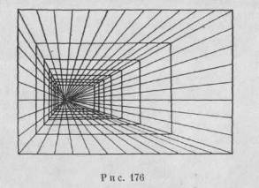 Фокусирование в одной точке производит мощный динамический эффект. Поскольку искажения удаляющихся форм компенсируются только частично, то все объекты выглядят сжатыми в третьем измерении. Это ощущение особенно сильно, потому что сжатие воспринимается не только как совершившийся факт, но как постепенное развитие. На периферии, как это показано на рис. 176, расстояния являются большими, а уменьшение размера протекает постепенно с небольшой скоростью. По мере того как глаз движется в сторону центра, линии, расположенные по соседству, приближаются друг к другу все быстрее и быстрее до тех пор, пока не достигается почти невыносимая степень сжатия. Этот эффект использовался в те периоды искусства и теми художниками, когда и кому приходилось по душе чувство наивысшей взволнованности. Даже архитектурная перспектива в искусстве стиля барокко была подчинена целям создания этого впечатляющего эффекта. На офортах Пиранези длинные фасады вдоль римских улиц засасывались пространственным фокусом с захватывающим дух крещендо. Среди современных художников очень любил пользоваться сильной конвергенцией Ван Гог. Другие художники всячески избегали эффекта удаляющихся линий. Поль Сезанн пользовался ими редко, а когда он сталкивался с необходимостью их употребления, то стремился нейтрализовать эффект удаляющихся линий посредством изменения их в направлении горизонтали либо вертикали.