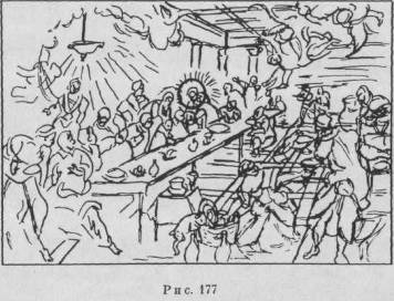 Когда центр изображенной сцены не совпадает с центром пространства, то до некоторой степени возникает эксцентричность. Например, в одном из вариантов картины «Тайная вечеря» художника Тинторетто (рис. 177), нарисованной им спустя примерно 60 лет после появления картины Леонардо да Винчи, фокусная точка комнаты, установленная линиями стола, пола, потолка, находится в правом верхнем углу. Однако центральной фигурой сюжета является фигура Христа (обведенная кружком). Эксцентричность пространства указывает на то, что закон вселенной потерял свою абсолютную ценность. Он присутствует как один из способов существования среди множества других, равно возможных. Его специфичный «уклон» обнаруживается глазом, в действие, имеющее место в этой раме, провозглашает свой собственный центр и свои собственные стандарты, явно пренебрегая при этом законами целого. Индивидуальное действие и авторитет управления превращаются в антагонистических партнеров, претендующих на обладание равными правами. В действительности же фигура Христа, если иметь в виду измерения по горизонтали, представляет собой центр рамы, так что посредством отклонения от требований окружающего мира личность достигает условий полной жизненности. Налицо изменение взглядов, которое в наиболее характерной манере отразило дух нового века.
