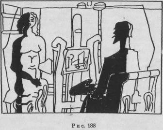Человеческие фигуры в картине Брака «Художник и натурщица» (рис. 188) показывают, что вечная борьба между светом и темнотой не осуществляется больше силами, которые прикладываются к миру предметов и не являются его частью. Теперь свет и тень являются мощными элементами самих этих фигур. Они сами образуют эти фигуры, а не просто прикладываются к ним. Темная часть женской фигуры — тонкая, она окружена многими вогнутостями, которые образуют профиль ее лица и выдвинутую вперед руку. Светлая часть фигуры женщины — крупная, окружена выпуклостями, уравновешена в более статичной фронтальной позиции, рука спрятана. В фигуре мужчины доминирует темнота, тогда как светлая часть не более чем слабое эхо второстепенного заднего контура. Обе части фигуры напряжены — как сами по себе, так и по отношению друг к другу,— передавая антагонизм контрастирующих сил, отражающий современное понимание человеческого общества и человеческого сознания.
