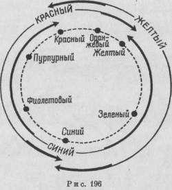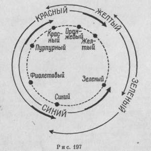 В этих условиях все рассуждения о дополнительных цветах остаются весьма запутанными. Мы не должны удивляться, если обнаружим, что цветовые круги, обозначающие дополняющие друг друга цвета в диаметральной противоположности, совпадают только приблизительно. Рис. 195 является примером подобного цветового круга. Тот факт, что эта диаграмма содержит в себе только семь цветов и ни одного естественного пигмента, говорит о ее более или