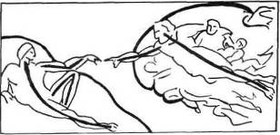 Но символическое значение выражается только косвенным путем — путем того, что нам говорят о содержании произведения наши знания и наши рассуждения. В ярких художественных произведениях самое глубокое значение постигается нашими глазами посредством восприятия перцептивных особенностей композиционной модели. История «Сотворения Адама» Микеланджело на потолке Сикстинской капеллы в Риме (рис. 208) понятна каждому человеку, читавшему «Книгу Бытия». Но эта история изображена так, что она сделалась еще более восприимчивой и впечатляющей. Бог, вместо того чтобы вдохнуть живой дух в глиняную массу, мотив который нелегко перевести в экспрессивную модель, тянется к руке Адама; словно оживляющая искра, перепрыгивающая с кончика одного пальца на другой, передается от создателя к его созданию.