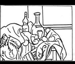 Каждый элемент произведения искусства является необходимым в раскрытии общей темы, которая изображает природу окружающего мира. В этом смысле мы обнаруживаем символизм даже в тех произведениях, которые кажутся на первый взгляд лишь изображением достаточно нейтральных объектов. Нам требуется всего лишь беглый взгляд на простое очертание двух натюрмортов, схематично изображенных на рис. 209, чтобы увидеть два различных подхода к реальной действительности. В картине Сезанна (рис.209, а) господствует устойчивая структура из вертикалей и горизонталей на заднем плане стола и осей бутылок и бокалов. Эта структурная основа настолько властвует в картине, что даже подчиняет себе складки скатерти. Простой порядок передается вертикальной симметрией каждой бутылки и бокала. Даже в неорганической материи — во вздымающихся очертаниях, в подчеркивании округлости и мягкости предметов — чувствуется изобилие. Сравните этот образ процветающего спокойствия с катастрофическим беспорядком в работе Пикассо (рис. 209,b). Стабильность в этой картине присутствует лишь отчасти. Не чувствуется ни горизонтальной, ни вертикальной ориентации. Комната находится в наклонном положении. Прямые углы стола, который перевернут, либо скрыты наклонным положением, либо искажены. Ни одна из ножек стола не изображена параллельно друг другу. Бутылке грозит опасность опрокинуться: Развалившееся на отдельные части туловище птицы, того и гляди, свалится со стола. Очертания предметов жесткие, острые, безжизненные даже при изображении тела птицы.
