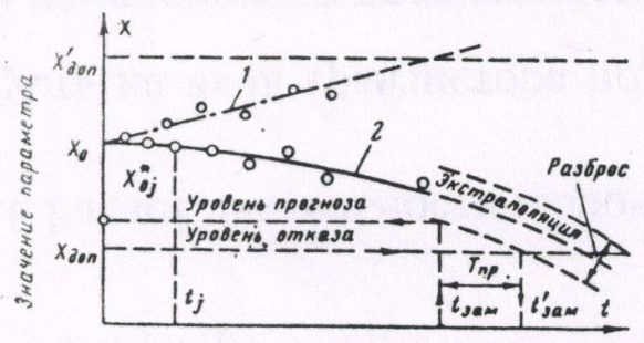 Чтобы за время между очередными, профилактическими работами параметр прогнозирования не уменьшился до уровня ниже уровня отказа, время замены (ремонта)определяют как tзам= t’зам—Тпр.По величине tзам определяют критическое значение параметра прогнозирования.