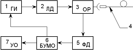 Вырабатываемые ГИ импульсы преобразуются в ЛД путем модуляции оптической несущей по интенсивности в зондирующие оптические импульсы, которые поступают через ОР в исследуемое волокно. Поток обратного рассеяния, возбуждаемый при распространении зондирующих импульсов в оптическом волокне, через оптический разветвитель поступает на вход чувствительного ФП, где преобразуется в электрический сигнал, который, после специальной обработки в БУМО, подается в канал вертикального отклонения УО, вызывая соответствующие изменения характеристики по вертикальной оси Y. Вертикальная ось градуируется в дБ.