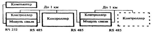 При необходимости ветвь контроллеров может быть увеличена еще на 1 км. Для этого удлиняемая ветвь (см. рисунок 6) подключается к первому контроллеру новой ветви через модуль связи. Для связи между контроллерами по прежнему используется интерфейс RS 485.