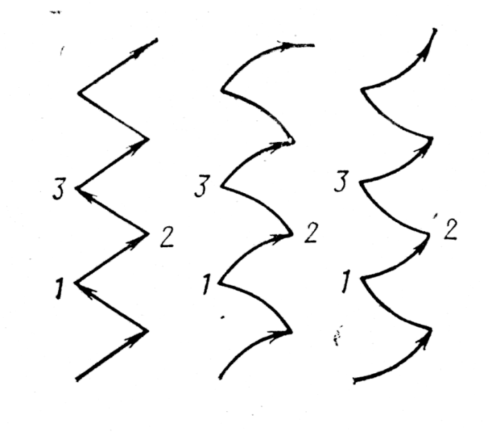 В точках 1, 2 и 3скорость перемещения электрода уменьшается, что способствует прогреванию кромок. В этом случае все кратеры расплавленного металла сливаются в одну ванну и обеспечивается наилучшее сплавление основного и наплавленного металла. При слишком большой ширине валика металл в точке 1 затвердеет к тому времени, когда дуга переместится в точку 3, и в этом месте могут образоваться непровары.