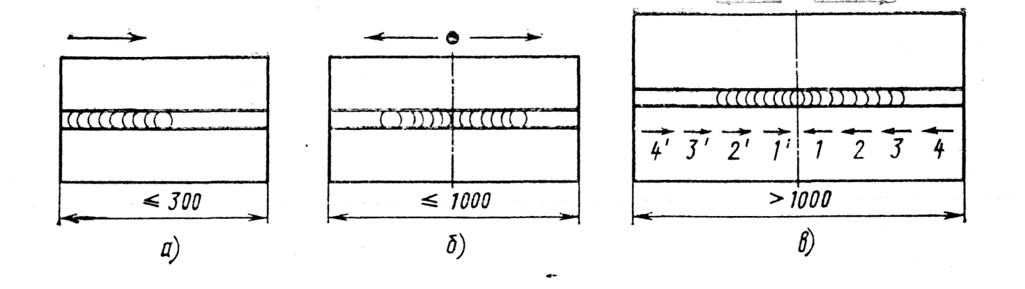 Рисунок 16 – Последовательность сварки швов различной длины (стрелками указано направление сварки):