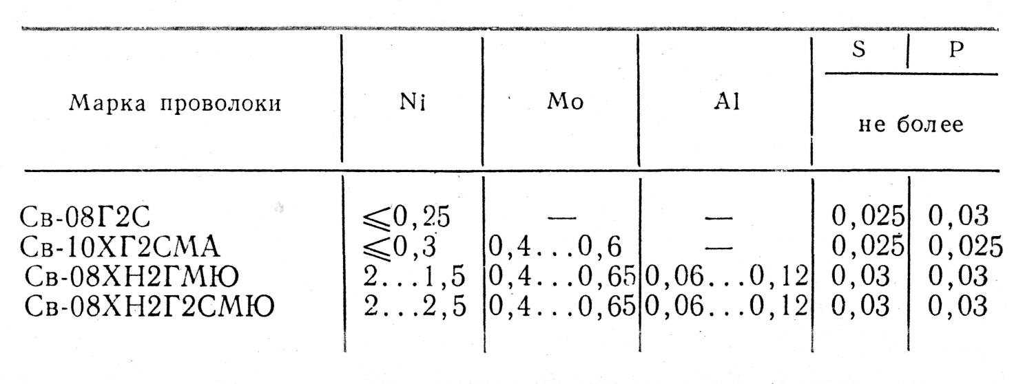 | Св-08Г2С Св-10ХГ2СМА Св-08ХН2ГМЮ Св-08ХН2Г2СМЮ | 0.05...0.11 0,06...0,12 0.06...О.11 0.06..0,11 | 0,7...0,95 0,6...0,9 0,25...0,55 0.4...07 | 1,5...2,1 1,7...2,1 1...1.4 1,5...1,9 | <0,2 0,8...1,1 0,7...1,1 0,7...1 |