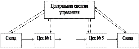 Выталкивающая система управления материальными потоками основана на прогнозировании размера запасов сырья, материалов, деталей для каждого звена логистической цепи. Исходя из этого прогноза осуществляется управление всем многоэтапным процессом производства путем обеспечения оправданного объема материального запаса на каждой стадии обработки. При данной системе управления материальными потоками предметы труда перемещаются с одного участка на другой (следующий по технологическому процессу) независимо от его готовности к обработке и потребности в этих деталях, т.е. без наличия соответствующего заказа. Материальный поток как бы “выталкивается” получателю по команде, поступающей из центральной системы управления производством (рис.4).