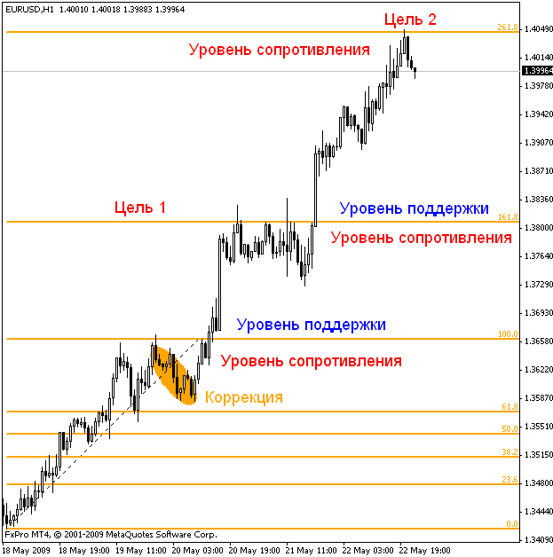 Рис. 13.5 Определение уровней сопротивления, поддержки и целей по уровням Фибоначчи