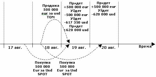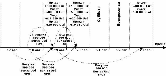 Однако если вы работаете на условиях маржинальной торговли с плечом, то у вас на счете, скорее всего, нет такого количества долларов, и вы не сможете 19 августа (в день расчетов) выполнить обязательства перед контрагентом. Поэтому вы должны продлить или "отсваповать" свою позицию. Предположим, будучи уверенным в своем движении вы не закрыли позицию 17 августа внутри дня и не собираетесь закрывать ее на следующий день, 18 августа. В таком случае вы делаете операцию Swap - Tom - Spot, т.е. проводите две противоположные сделки различными датами расчетов. Допустим, что вы правы в своем решении и цена Eur/Usd действительно выросла за предыдущие сутки, остановившись на 1,24. 18 августа вы продаете 500 000 eur/usd (по 1,2400) на условиях Tom т.е. с датой расчетов 19 августа и покупаете их (по 1,2400) на условиях