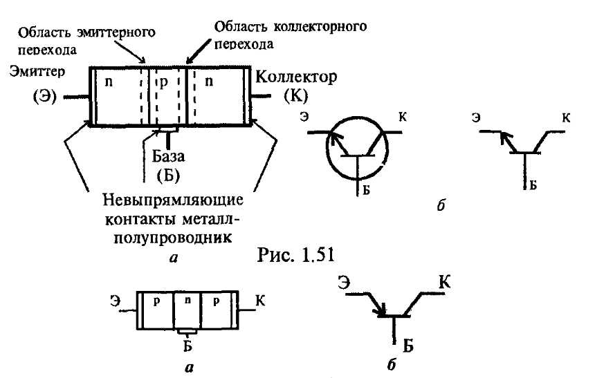 Биполярный транзистор в своей основе содержит три слоя полупроводника (p-n-p или n-p-n) и соответственно 2 p-n перехода. Средний слой и соответствующий вывод называют базой, один из крайних слоев называется коллектором, а другой крайний слой – эммитером.