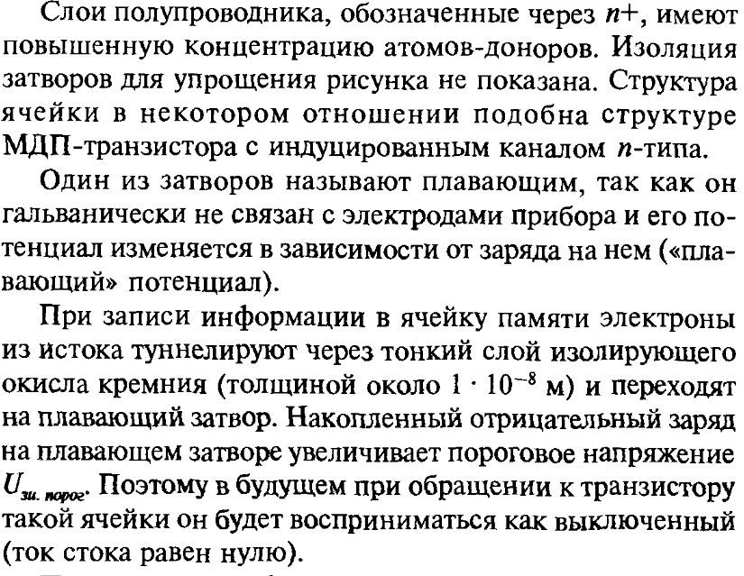 Слои полупроводника, обозначенные через n+, имеют повышенную концентрацию атомов-доноров. Изоляция затворов для упрощения рисунка не показана. Структура ячейки в некотором отношении подобна структуре МДП-транзистора с индуцированным каналом n-типа.
