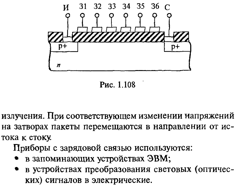 При отрицательном напряжении на некотором затворе скапливаются дырки, совокупность которых называется пакетом. Пакеты образуются из дырок, инжектированных истоком или возникающих в результате генерации пар электрон-дырка при поглощении оптического излучения. При соответствующем изменении напряжений на затворах пакеты перемещаются от истока к стоку.