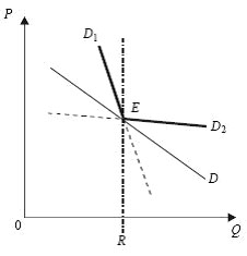 R – линия разделения рынка; D1E – отрезок кривой спроса на «дорогом» рынке; ED2 – отрезок кривой спроса на «дешевом» рынке.