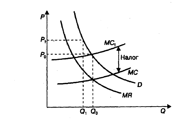 Поскольку налог увеличивает предельные издержки, их кривая МС сместится влево и вверх в положение МС1 как это показано на рис. 12.3. Фирма теперь будет максимизировать свою прибыль в очке пересечения Р1 и Q1.