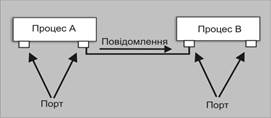 Процеси поділяються на прикладні і системні. Прикладний процес ототожнюється з реалізацією певних процедур, пов’язаних з обробкою інформації під час вирішення завдань користувача. Системні ж процеси визначають виконання допоміжних функцій, пов’язаних із забезпеченням прикладних процесів. До системних процесів належать: організація зв’язку між прикладними процесами, керування каналами передачі даних, активізація терміналів тощо. Процес, як будь-який динамічний об’єкт, триває у часі і складається з етапів ініціювання, виконання і завершення. При цьому процес може породжуватись користувачем, системою або іншим процесом. Вхідні і вихідні дані передаються у формі повідомлень через логічні точки доступу, які називаються портами. Через вхідні порти вводяться дані для конкретного процесу, відповідно через вихідні порти поточний процес видає результати оброблених даних. Взаємодія процесів (рис. 1.6) здійснюється шляхом обміну повідомленнями, які являють собою блоки даних певної структури. Проміжок часу, протягом якого взаємодіють процеси, називається сеансом обміну або сесією. Під час сеансу обміну процес формує повідомлення і потрібну для його передачі супроводжуючу інформацію. Залежно від завдання, що вирішується, взаємодіючі процеси можуть генеруватися в одній або суміжних системах.