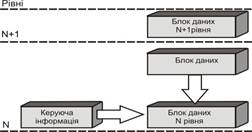 Він складається з керуючого поля, яке називається заголовком, і поля даних. Заголовок N-го блоку містить керуючу інформацію, сформовану на N-му рівні (рис. 1.9). Вміст поля даних N-го рівня являє собою блок даних (N+1)-го рівня. Так формується вкладена структура: протокольні блоки даних, починаючи з верхнього рівня, вкладаються один в одного. При передачі інформації в зворотному напрямку відбувається процедура «розпакування» блоків.