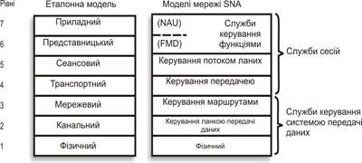 Як і еталонна модель OSI, системна мережева архітектура SNA визначає багаторівневу модель протоколів, інтерфейсів і програм. Відповідність рівнів моделі SNA і еталонної моделі OSI показано на рис. 1.11. Розходження у кількості рівнів і часткова їхня невідповідність пояснюється архітектурними особливостями мережі SNA. Насамперед, це стосується структури середовища передачі і організації передачі даних. Як відомо, еталонна модель OSI орієнтована на мережі комутації пакетів, тоді як мережа SNA передбачає більш просту систему передачі даних. Далі — орієнтація мережі SNA на відносно обмежений перелік апаратури не потребує реалізації у повному обсязі функцій представницького рівня. У свою чергу орієнтація на певну структуру системи передачі мережі SNA дає можливість більш чітко визначити методи і протоколи маршрутизації.