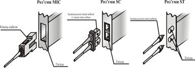 Для підключення мережних пристроїв до оптоволоконного кабелю використовуються роз’єми типу MIC, SC або ST (рис. 2.10).